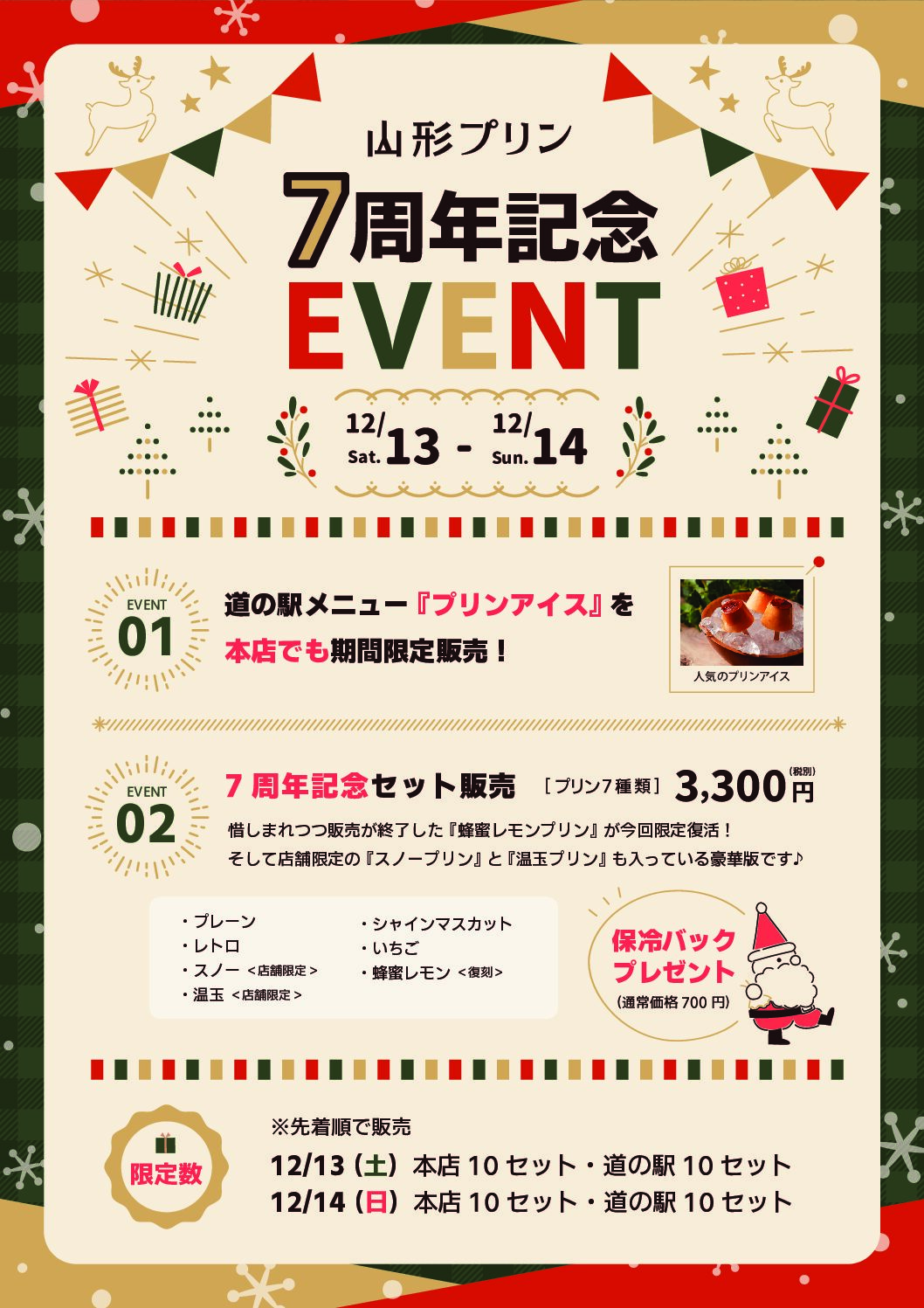 今回の目玉はなんといっても… この2日間しか手に入らない「7周年記念セット」。惜しまれつつ販売終了した幻の「蜂蜜レモンプリン」が、このセット限定で復刻します✨さらに、普段はそれぞれの店舗でしか会えない「スノープリン」や「温玉プリン」も一度に楽しめる、まさに夢のラインナップ。